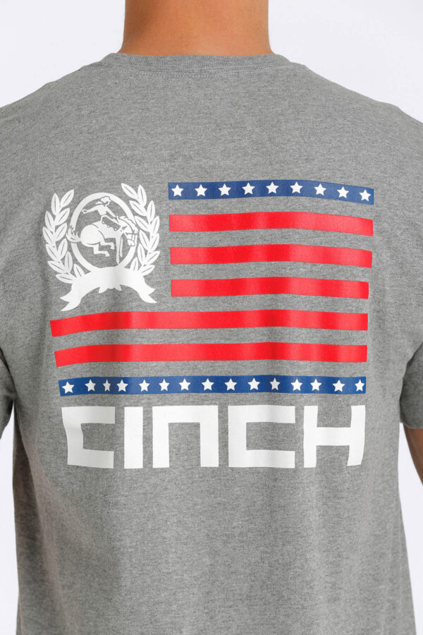 Cinch shows its love for America with this Grey American Flag tee. The American Flag is screen printed on the back of this grey tee shirt with Cinch written below and their logo replacing the stars.