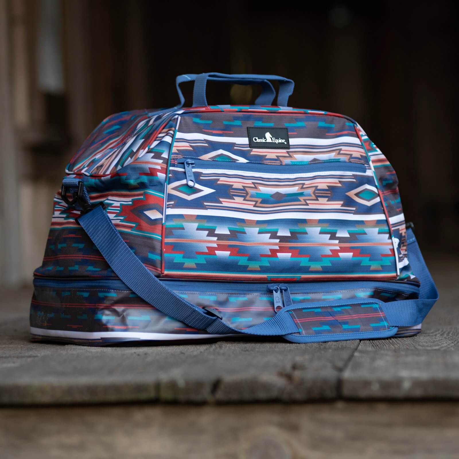 The uniquely large undercarriage compartment of this Classic Equine Weekender Duffle – Pueblo is perfect for storing dirty boots and shoes, keeping them separate from your clean clothes.