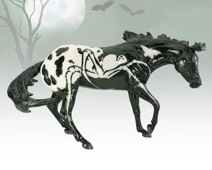 While the Breyer Arachne 2025 Halloween Horse appears to have a flashy blanket appaloosa pattern from a distance, upon closer look you’ll notice her blanket is made up of two large spiders on the prowl! A moth and firefly dance just out of their reach, flying to safety…this time.