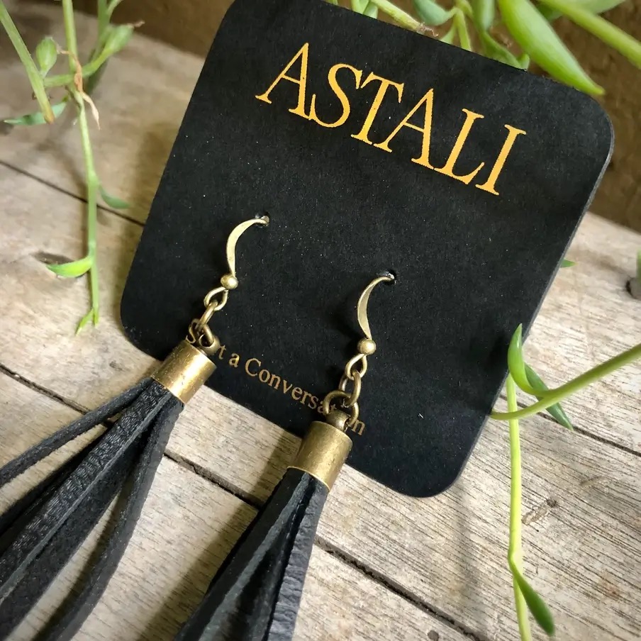These Astali Mini Tassel Earrings earrings are made from soft black deerskin leather. Part Western, part Boho, part Rock ‘n Roll, these little fringe earrings give a big kick to any outfit.