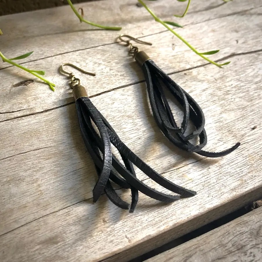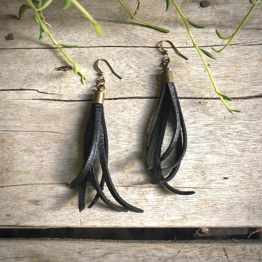 These tassel earrings are made from soft black deerskin leather. Part Western, part Boho, part Rock ‘n Roll, these little fringe earrings give a big kick to any outfit.