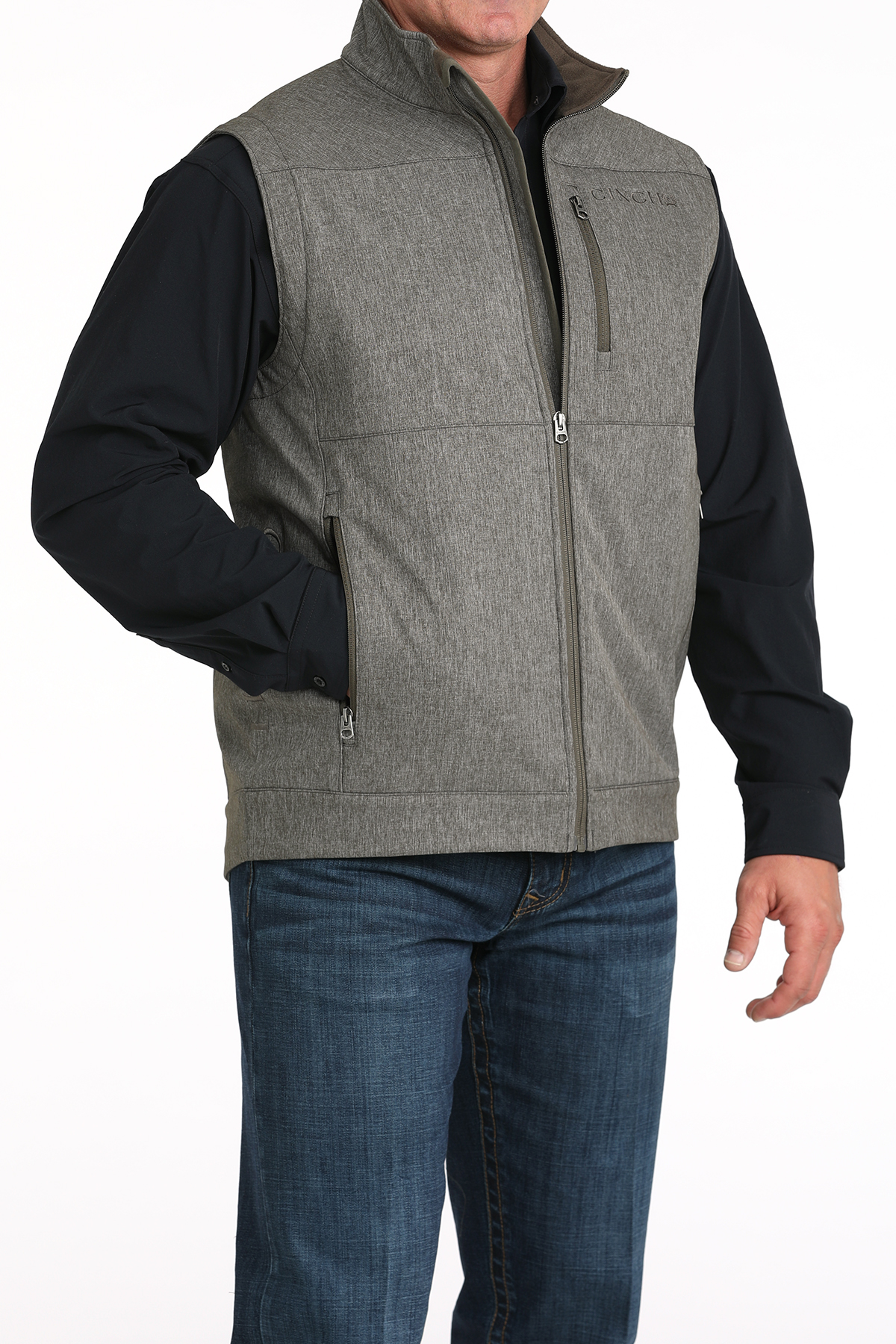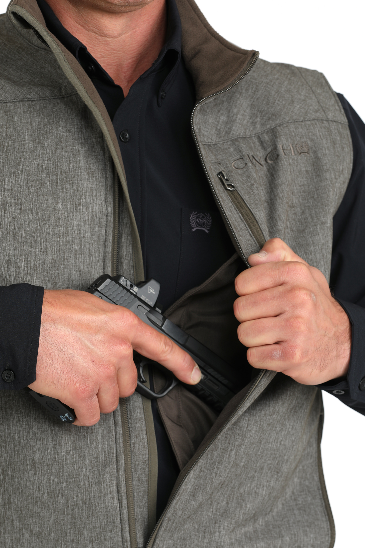 This Cinch Bonded Logo Vest CC Heather Olive crafted by CINCH is the versatile layer you need for an early morning hunt or a ride out on the trail. Stylish and stretch friendly poly-spandex bonded construction features two concealed inner pockets and a Velcro backed holster, convenient exterior pockets, logo embroidery, and Durable Water Resistant (DWR) finish for keeping warm and dry.