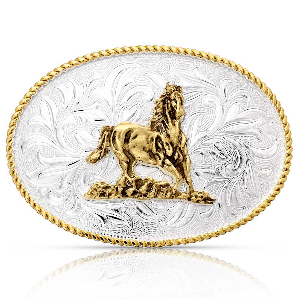 Unleash your untamed spirit by wearing the Rosebud Legacy Buckle with a Galloping Horse. This buckle features an impressive gold toned rope border and floral silver toned engravings that create the surface of the buckle. A majestic gold toned horse creates the centerpiece of the buckle. This buckle has a 1.5 inch back swivel.