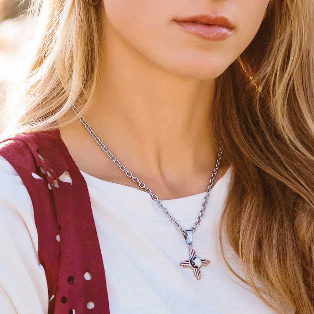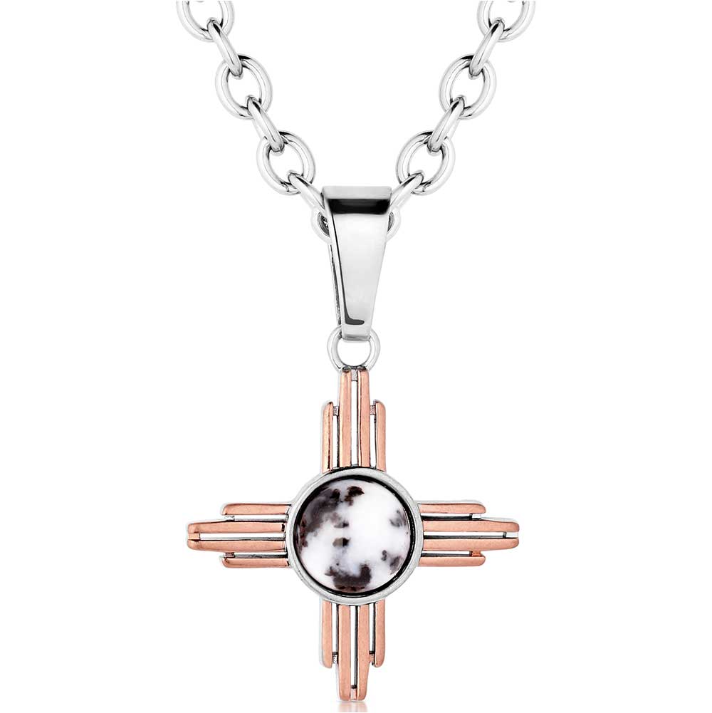 Find the spirit of the Southwest with the Western Sands Necklace. The pendant of the necklace has a cross shape in a bright rose gold finish. A round crafted howlite stone sits in the center of the pendant creating a unique look. This necklace has a 21 inch adjustable chain. Stone color will vary.