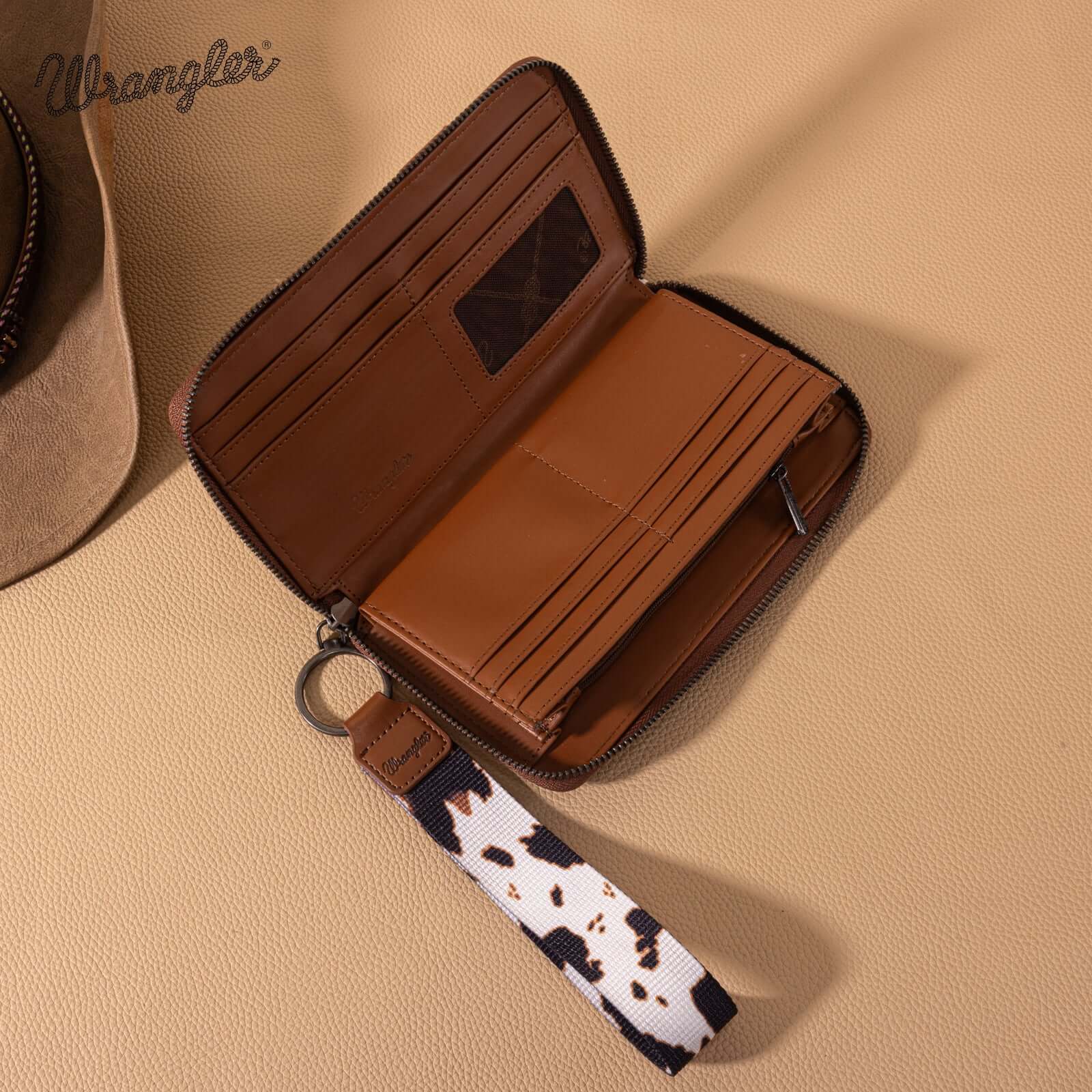 This Wrangler Cow Print Wallet in brown is a subtle but elegant women’s wallet, card cases & money organizers. Carry all the essentials and keep it attached with the removable wristlet strap so you have it ready at a moments notice.